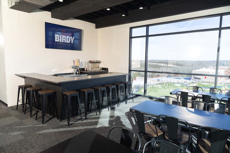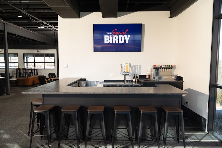 This commercial installation features durable stone surfaces designed for high traffic and performance. The dark granite bar top provides a sleek, professional appearance while standing up to heavy daily use.